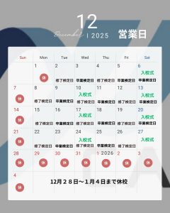 休校中のお問合せについては、2026年1月5日以降ご連絡させていただきます。