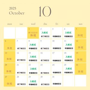 - 10月1日(水)入校式→10月2日(木)に変更します。